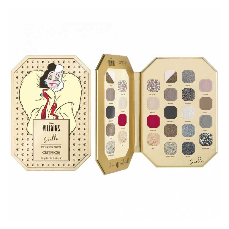 Palette enchanteresse : la palette de fards à paupières CATRICE Disney Villains Cruella contient 18 teintes parfaitement alignées, des teintes mates et satinées aux reflets et métallisés. Les teintes hautement pigmentées peuvent être combinées pour créer des looks complètement différents - les fards à paupières sont particulièrement faciles à appliquer à l'aide de l'essence Disney Villains Ursula Eyeshadow Brush et à mélanger avec l'essence Disney Villains Scar Blender Brush. De plus, les couleurs des fards à paupières durent longtemps et ont un délicat parfum de vanille. Le design est inspiré du personnage de Disney Cruella de Vil.