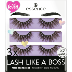 Trois bandes de faux cils essence LASH LIKE A BOSS dans un seul kit ! Grâce à leur effet 3D, ces faux cils vous offrent un volume extrême et un fini époustouflant. Grâce à leur bande souple, ces faux cils réutilisables se posent facilement. Colle incluse. Longue tenue.